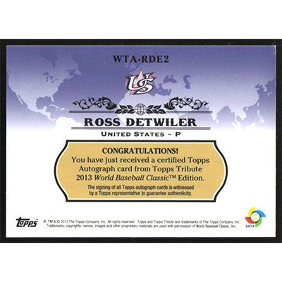 This is a 2013 Topps Tribute WBC Autographs Sepia Ross Detwiler autographed baseball card. This card has been signed, in blue, by Ross Detwiler, and is certified authentic by Topps. The card is #WTA-RDE2 and pictures show condition. This card is limited; #'d 15/35.
