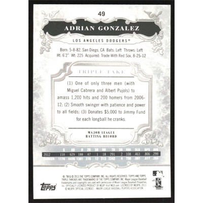 This is a 2013 Topps Triple Threads Adrian Gonzalez baseball card. The card is #49 and pictures show condition.