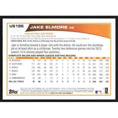 This is a 2013 Topps Update Emerald Jake Elmore baseball card. The card is #US186 and pictures show condition.