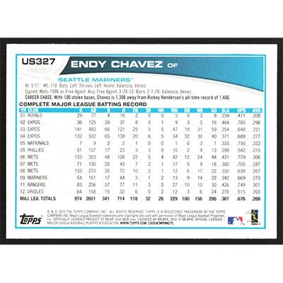 This is a 2013 Topps Update Emerald Endy Chavez baseball card. The card is #US327 and pictures show condition.
