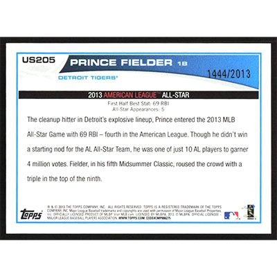 This is a 2013 Topps Update Gold Prince Fielder All-Star baseball card. The card is #US205 and pictures show condition. This card is limited; #'d 1444/2013.
