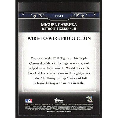 This is a 2013 Topps Update Postseason Heroes Miguel Cabrera baseball card. The card is #PH-17 and pictures show condition.