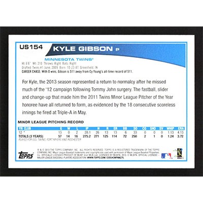 This is a 2013 Topps Update Kyle Gibson baseball card. The card is #US154 and pictures show condition.