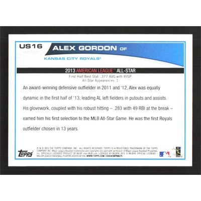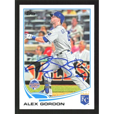 This is a 2013 Topps Update Alex Gordon All-Star autographed baseball card. This card has been signed, in blue, by Alex Gordon, and is guaranteed authentic by Ballcardz.com. The card is #US16 and pictures show condition.