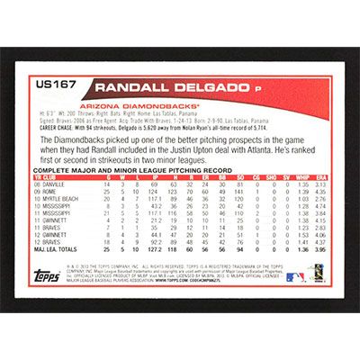 This is a 2013 Topps Update Randall Delgado baseball card. The card is #US167 and pictures show condition.