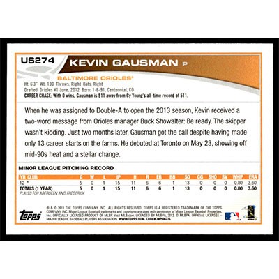 This is a 2013 Topps Update Kevin Gausman baseball card. The card is #US274 and pictures show condition.