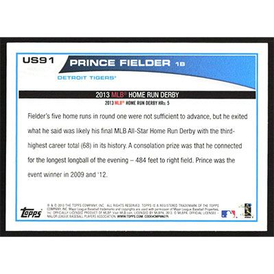 This is a 2013 Topps Update Prince Fielder Home Run Derby baseball card. The card is #US91 and pictures show condition.