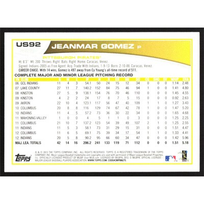 This is a 2013 Topps Update Jeanmar Gomez baseball card. The card is #US92 and pictures show condition.