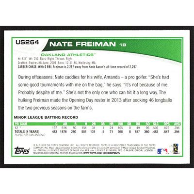 This is a 2013 Topps Update Wal-Mart Blue Nate Freiman baseball card. The card is #US264 and pictures show condition. Team(s): Oakland Athletics Rookie Card (RC)