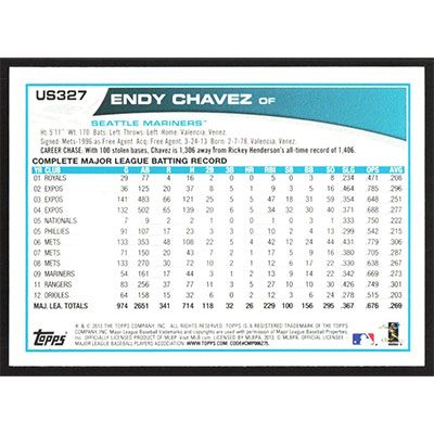 This is a 2013 Topps Update Wal-Mart Blue Endy Chavez baseball card. The card is #US327 and pictures show condition.