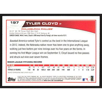 This is a 2013 Topps Wal-Mart Blue Tyler Cloyd baseball card. The card is #197 and pictures show condition.