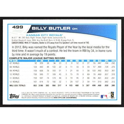 This is a 2013 Topps Wal-Mart Blue Billy Butler baseball card. The card is #499 and pictures show condition.