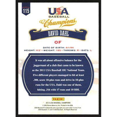 This is a 2013 USA Baseball Champions David Dahl baseball card. The card is #115 and pictures show condition.