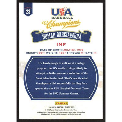 This is a 2013 USA Baseball Champions Nomar Garciaparra baseball card. The card is #23 and pictures show condition.