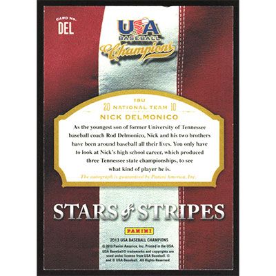 This is a 2013 USA Baseball Champions Stars & Stripes Signatures Red Ink Nick Delmonico autographed baseball card. This card has been signed, in blue, by Nick Delmonico, and is certified authentic by Panini. The card is #DEL and pictures show condition. This card is limited; #'d 25-Jan.