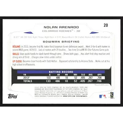 This is a 2014 Bowman Nolan Arenado baseball card. The card is #20 and pictures show condition.