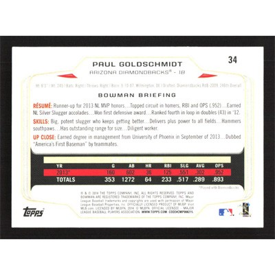 This is a 2014 Bowman Paul Goldschmidt baseball card. The card is #34 and pictures show condition.