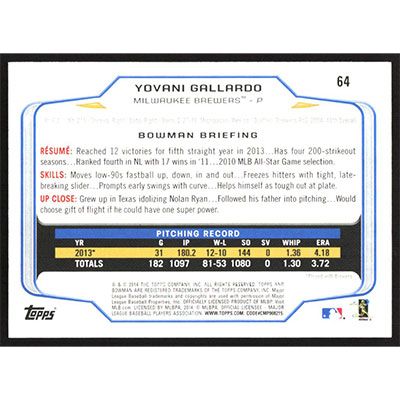 This is a 2014 Bowman Yovani Gallardo baseball card. The card is #64 and pictures show condition.