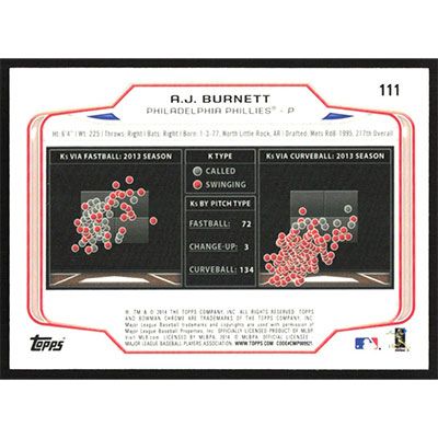 This is a 2014 Bowman Chrome A.J. Burnett baseball card. The card is #111 and pictures show condition.