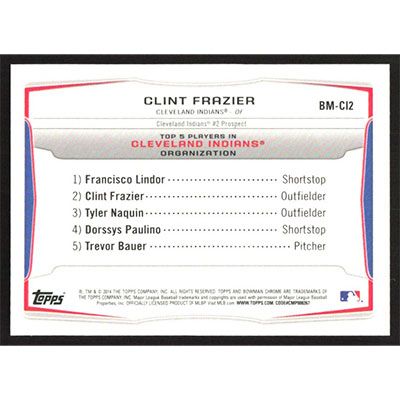 This is a 2014 Bowman Chrome Bowman Scout Top 5 Mini Refractors Clint Frazier baseball card. The card is #BM-CI2 and pictures show condition. Team(s): Cleveland Indians