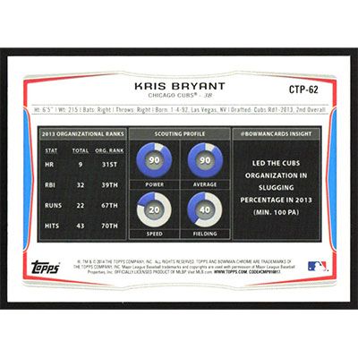 This is a 2014 Bowman Chrome Draft Top Prospects Blue Wave Refractors Kris Bryant baseball card. The card is #CTP-62 and pictures show condition. Team(s): Chicago Cubs