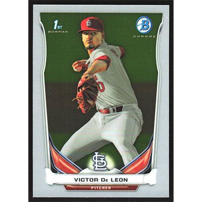 This is a 2014 Bowman Chrome Prospects Victor De Leon baseball card. The card is #BCP101 and pictures show condition.