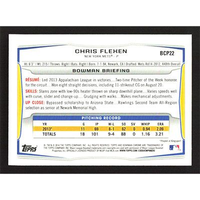 This is a 2014 Bowman Chrome Prospects Chris Flexen baseball card. The card is #BCP22 and pictures show condition.