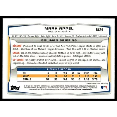 This is a 2014 Bowman Chrome Prospects Mark Appel baseball card. The card is #BCP5 and pictures show condition.