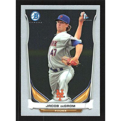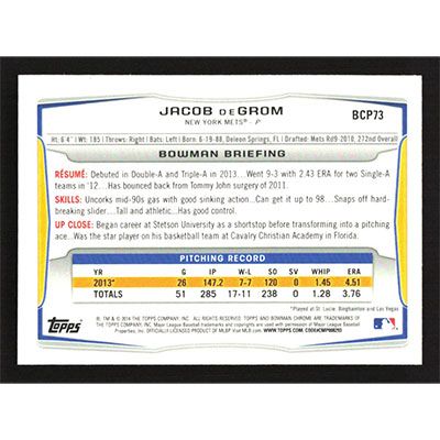 This is a 2014 Bowman Chrome Prospects Jacob deGrom baseball card. The card is #BCP73 and pictures show condition.