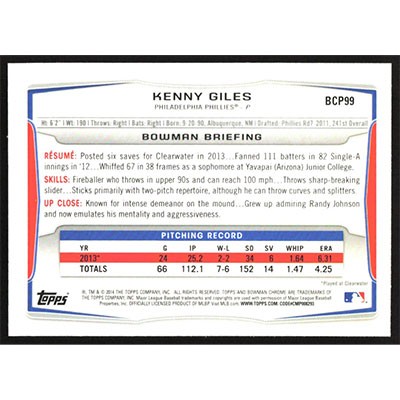 This is a 2014 Bowman Chrome Prospects Kenny Giles baseball card. The card is #BCP99 and pictures show condition.