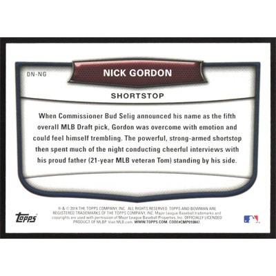 This is a 2014 Bowman Draft Draft Night Nick Gordon baseball card. The card is #DN-NG and pictures show condition.