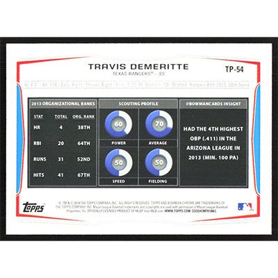 This is a 2014 Bowman Draft Top Prospects Travis Demeritte baseball card. The card is #TP-54 and pictures show condition.