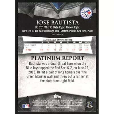 This is a 2014 Bowman Platinum Jose Bautista baseball card. The card is #33 and pictures show condition.