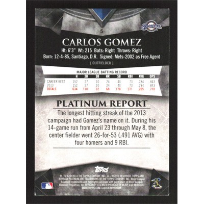 This is a 2014 Bowman Platinum Carlos Gomez baseball card. The card is #5 and pictures show condition.