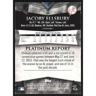 This is a 2014 Bowman Platinum Jacoby Ellsbury baseball card. The card is #53 and pictures show condition.