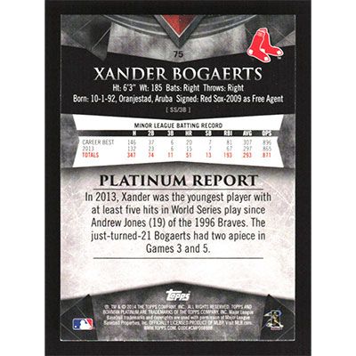 This is a 2014 Bowman Platinum Xander Bogaerts baseball card. The card is #75 and pictures show condition.