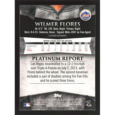 This is a 2014 Bowman Platinum Wilmer Flores baseball card. The card is #82 and pictures show condition.