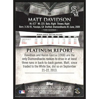 This is a 2014 Bowman Platinum Matt Davidson baseball card. The card is #85 and pictures show condition.