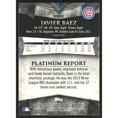 This is a 2014 Bowman Platinum Chrome Prospects Purple Refractors Javier Baez baseball card. The card is #BPCP50 and pictures show condition. Team(s): Chicago Cubs