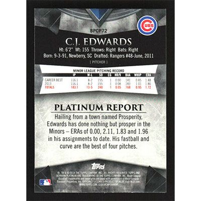 This is a 2014 Bowman Platinum Chrome Prospects Purple Refractors C.J. Edwards baseball card. The card is #BPCP72 and pictures show condition. Team(s): Chicago Cubs