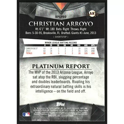 This is a 2014 Bowman Platinum Chrome Prospects Purple Refractors Christian Arroyo baseball card. The card is #BPCP89 and pictures show condition. Team(s): San Francisco Giants