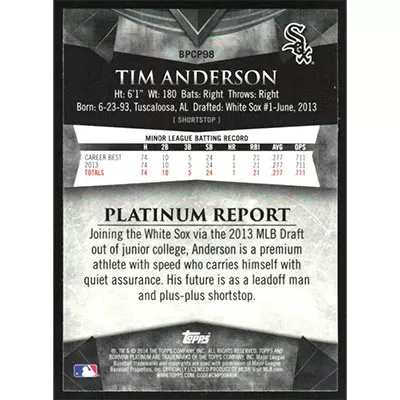 This is a 2014 Bowman Platinum Chrome Prospects Purple Refractors Tim Anderson baseball card. The card is #BPCP98 and pictures show condition. Team(s): Chicago White Sox