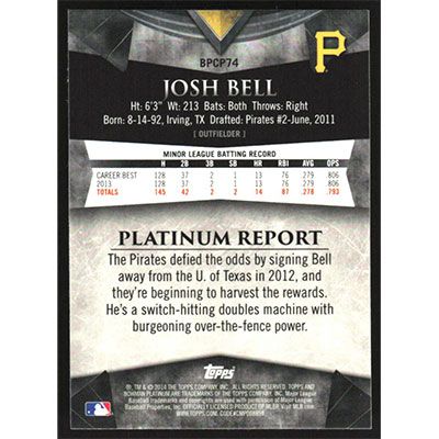 This is a 2014 Bowman Platinum Chrome Prospects Refractors Josh Bell baseball card. The card is #BPCP74 and pictures show condition. Team(s): Pittsburgh Pirates