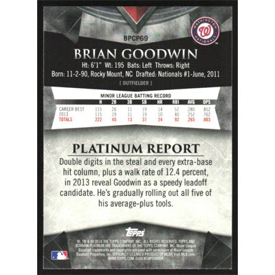 This is a 2014 Bowman Platinum Chrome Prospects X-Fractors Brian Goodwin baseball card. The card is #BPCP69 and pictures show condition.