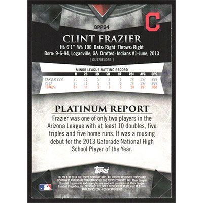 This is a 2014 Bowman Platinum Prospects Clint Frazier baseball card. The card is #BPP24 and pictures show condition.
