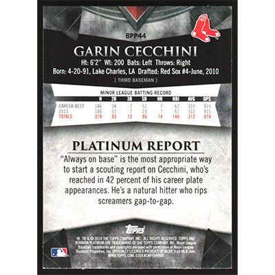 This is a 2014 Bowman Platinum Prospects Garin Cecchini baseball card. The card is #BPP44 and pictures show condition.