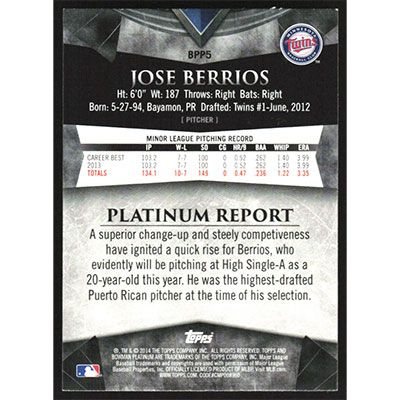 This is a 2014 Bowman Platinum Prospects Jose Berrios baseball card. The card is #BPP5 and pictures show condition.