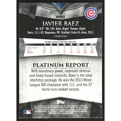 This is a 2014 Bowman Platinum Prospects Javier Baez baseball card. The card is #BPP50 and pictures show condition.