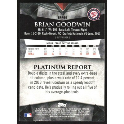This is a 2014 Bowman Platinum Prospects Brian Goodwin baseball card. The card is #BPP69 and pictures show condition.