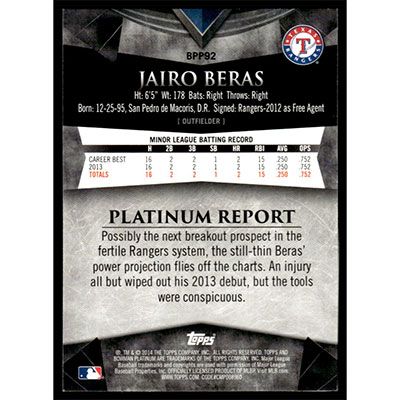 This is a 2014 Bowman Platinum Prospects Jairo Beras baseball card. The card is #BPP92 and pictures show condition.